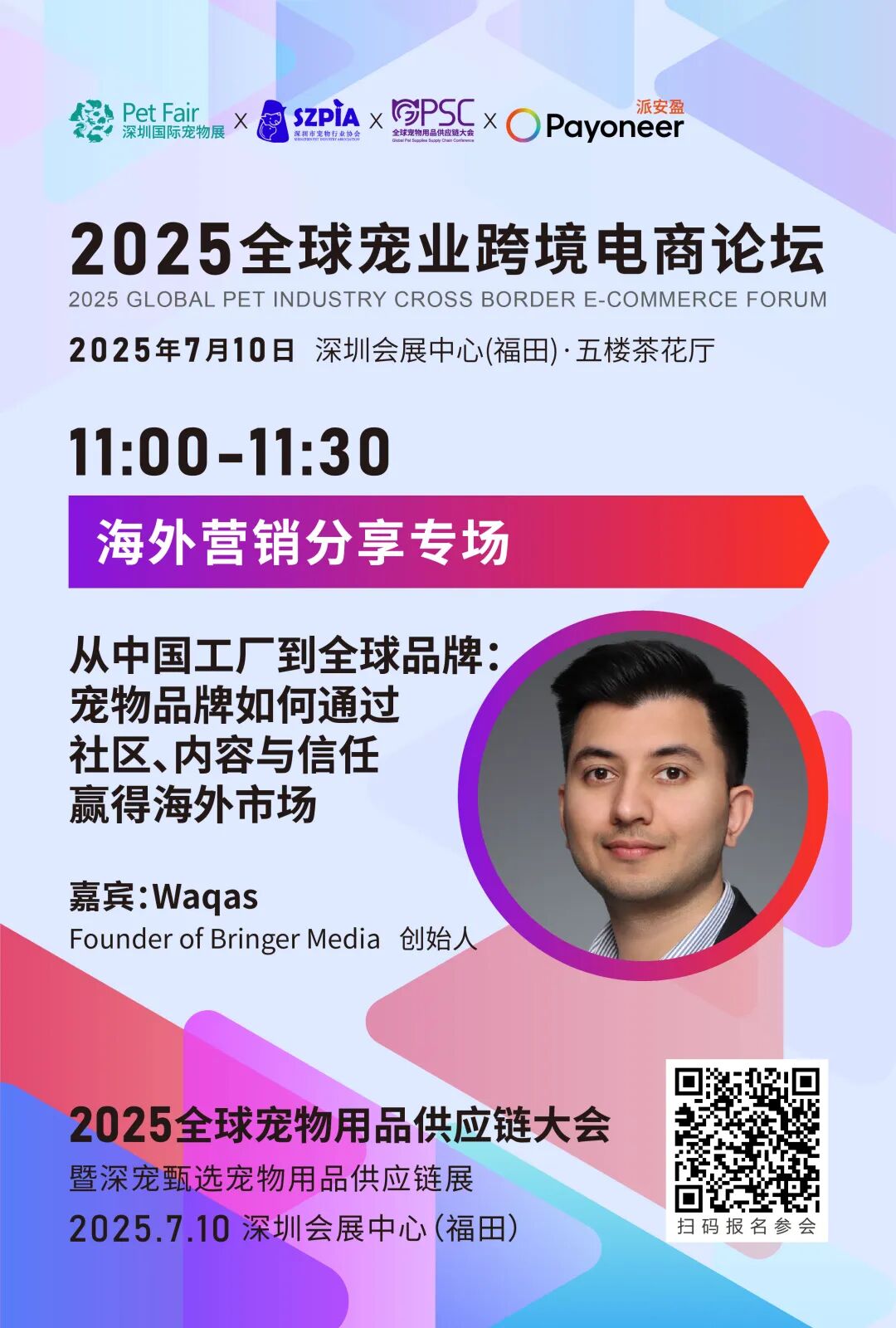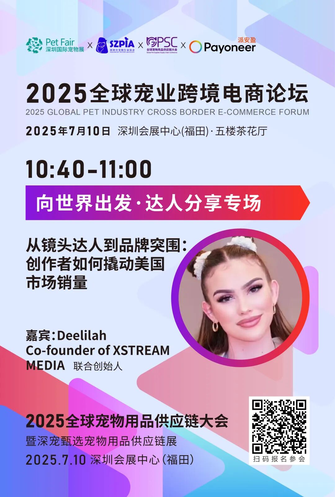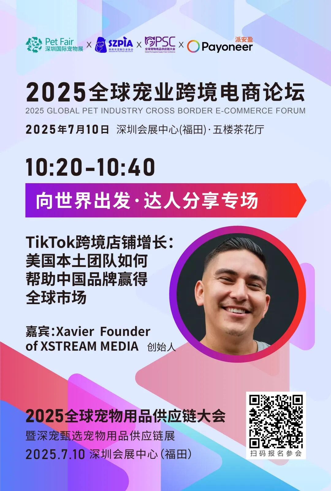 2025全球宠业跨境电商论坛·海外营销专场&红人KOL选品会,特邀XSTREAM MEDIA创始人Xavier、Deelilah,Bringer Media创始人Waqas,带来“TikTok跨境店铺增长:美国本土团队如何帮助中国品牌赢得全球市场”等主题分享,深度拆解海外本土团队运营逻辑与内容创作密码,用一线案例解锁流量破局、品牌拓展与市场渗透的核心路径。同期举办:海外红人KOL选品会,整合海外红人KOL优质资源,锁定海外宠主热点需求,助力中国宠物用品借助红人KOL通往全球市场。